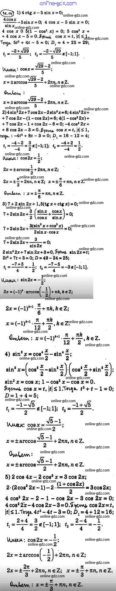 Готовые домашние задания по Алгебре за 10 класс Учебник Мерзляк, Номировский Алгоритм успеха Базовый уровень 2022 - §30. Тригонометрические уравнения, сводящиеся к алгебраическим 30.14