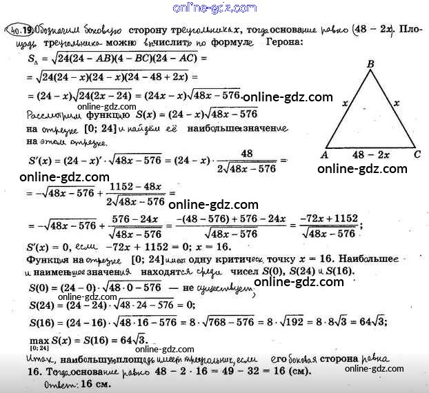 Готовые домашние задания по Алгебре за 10 класс Учебник Мерзляк, Номировский Алгоритм успеха Базовый уровень 2022 - §40. Применение производной при нахождении наибольшего и наименьшего значений функции 40.19