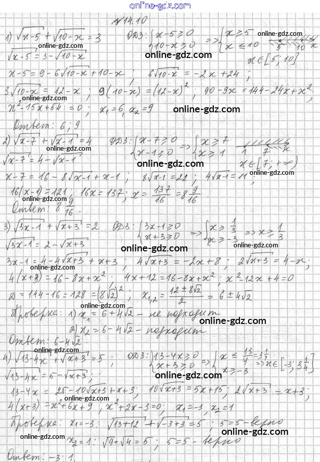 Готовые домашние задания по Алгебре за 10 класс Учебник Мерзляк, Номировский Алгоритм успеха Углубленный уровень 2019 - §14. Иррациональные уравнения 14.10