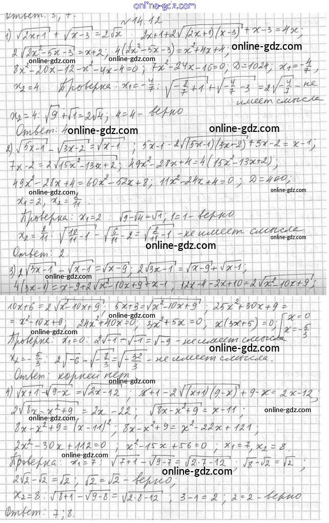 Готовые домашние задания по Алгебре за 10 класс Учебник Мерзляк, Номировский Алгоритм успеха Углубленный уровень 2019 - §14. Иррациональные уравнения 14.12