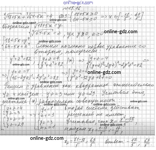 Готовые домашние задания по Алгебре за 10 класс Учебник Мерзляк, Номировский Алгоритм успеха Углубленный уровень 2019 - §15. Различные приёмы решения иррациональных уравнений и их систем 15.16