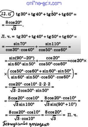 Готовые домашние задания по Алгебре за 10 класс Учебник Мерзляк, Номировский Алгоритм успеха Углубленный уровень 2019 - §27. Формулы для преобразования суммы, разности и произведения тригонометрических функций 27.15