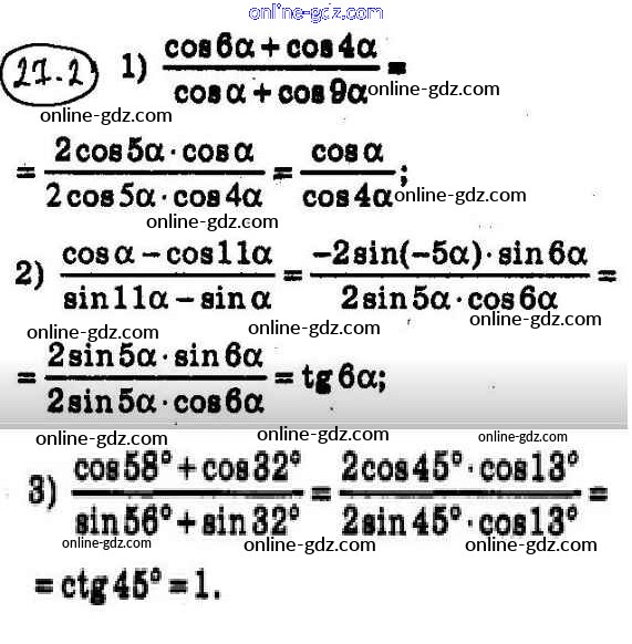 Готовые домашние задания по Алгебре за 10 класс Учебник Мерзляк, Номировский Алгоритм успеха Углубленный уровень 2019 - §27. Формулы для преобразования суммы, разности и произведения тригонометрических функций 27.2