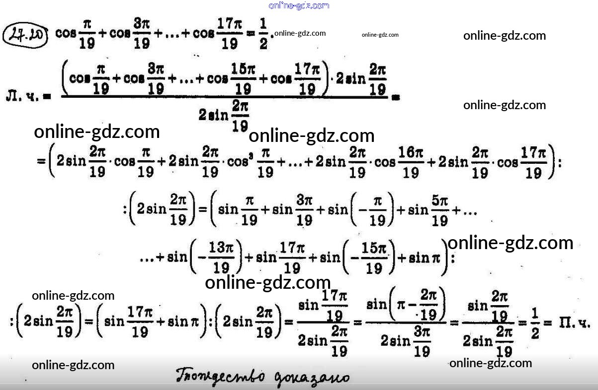 Готовые домашние задания по Алгебре за 10 класс Учебник Мерзляк, Номировский Алгоритм успеха Углубленный уровень 2019 - §27. Формулы для преобразования суммы, разности и произведения тригонометрических функций 27.20