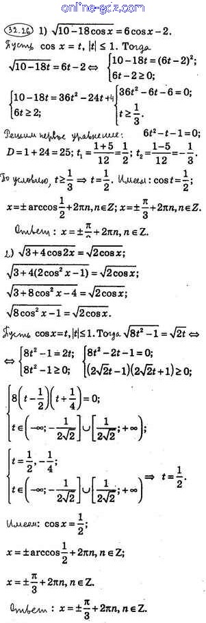 Готовые домашние задания по Алгебре за 10 класс Учебник Мерзляк, Номировский Алгоритм успеха Углубленный уровень 2019 - §32. Тригонометрические уравнения, сводящиеся к алгебраическим 32.26