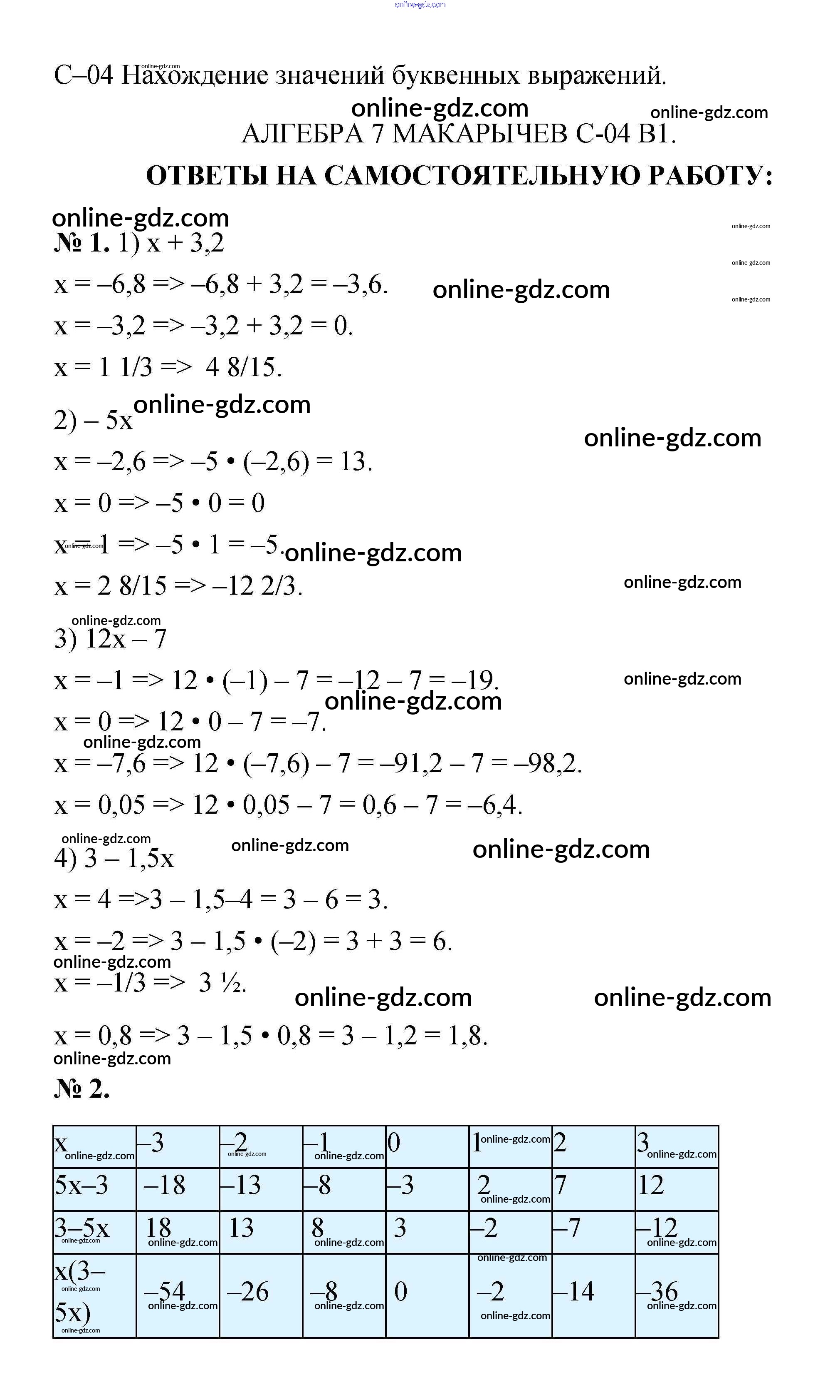 Готовые домашние задания по Алгебре за 7 класс Дидактические материалы Звавич, Кузнецова 2012 - Вариант 1 Самостоятельные работы. Варианты С-4. Нахождение значений буквенных выражений