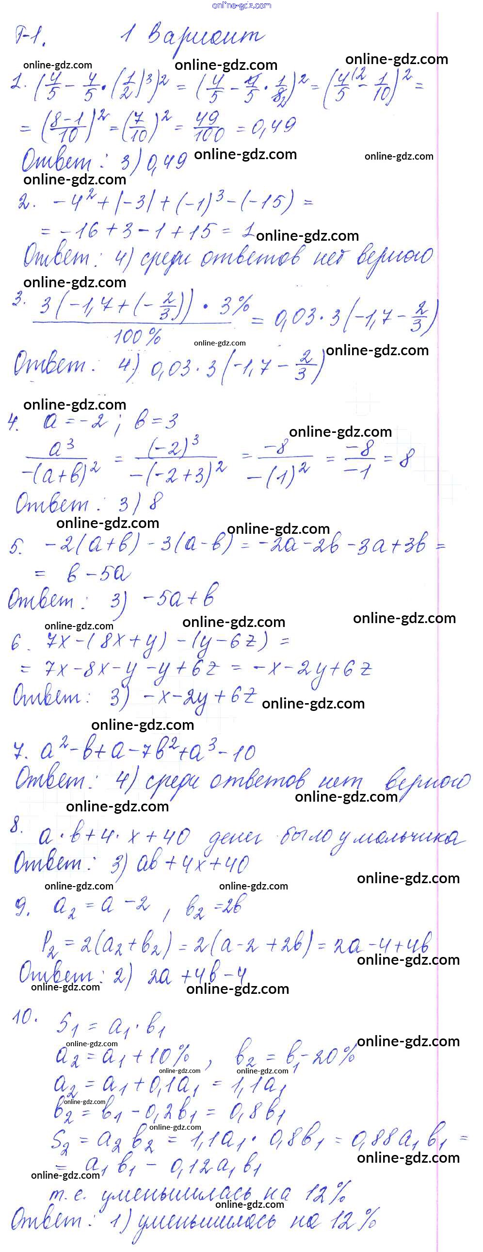 Готовые домашние задания по Алгебре за 7 класс Дидактические материалы Дьяконова УМК 2018 - Тест 1 Тесты Вариант 1