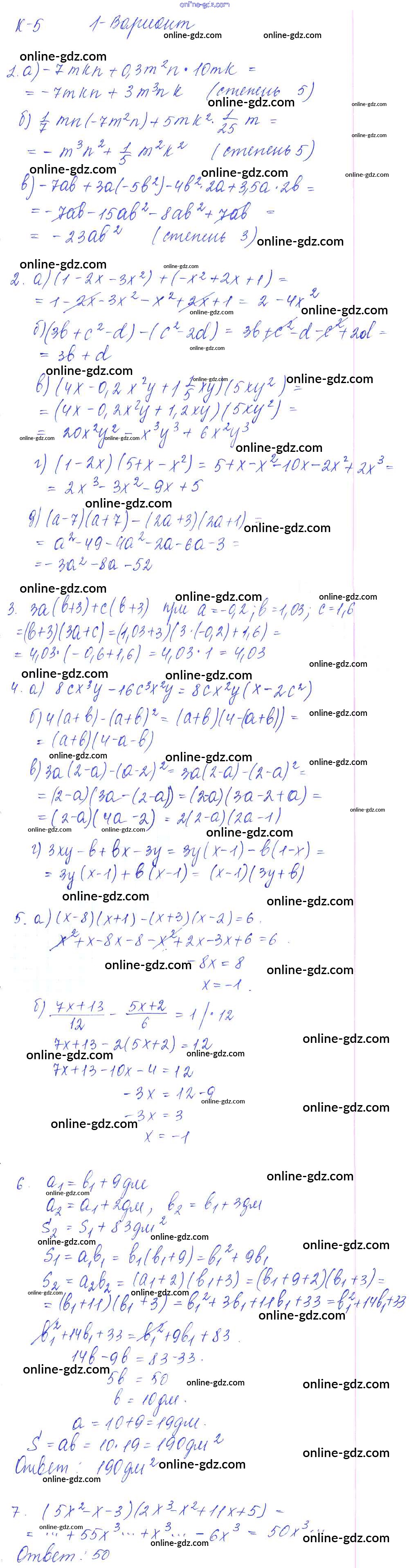 Готовые домашние задания по Алгебре за 7 класс Дидактические материалы Дьяконова УМК 2018 - КР-5 Контрольные работы Вариант 1