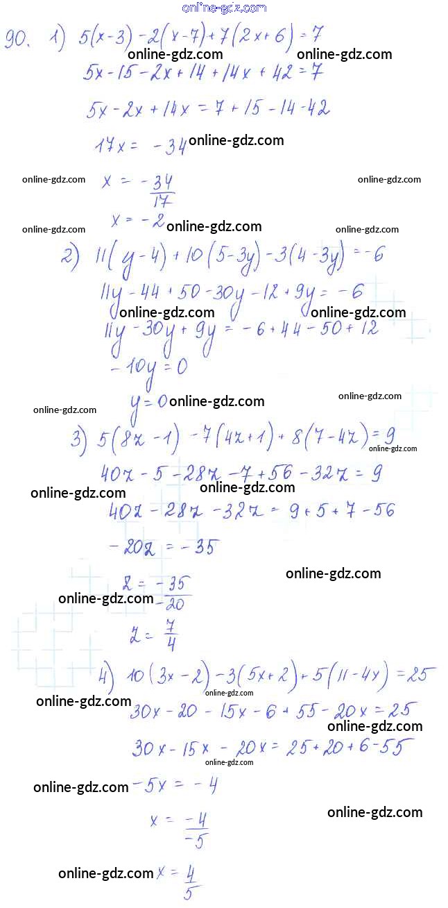 Готовые домашние задания по Алгебре за 7 класс Учебник Алимов, Колягин 2014 - §7. Решение уравнений с одним неизвестным, сводящихся к линейным Глава 2. Уравнения с одним неизвестным 90