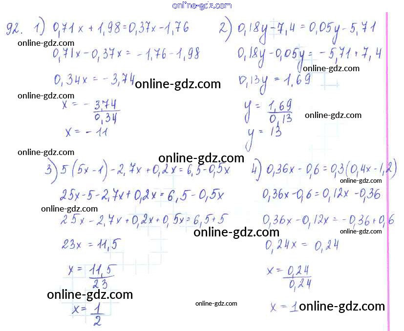 Готовые домашние задания по Алгебре за 7 класс Учебник Алимов, Колягин 2014 - §7. Решение уравнений с одним неизвестным, сводящихся к линейным Глава 2. Уравнения с одним неизвестным 92