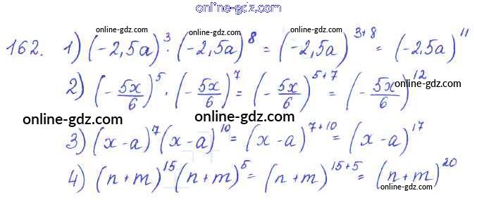 Готовые домашние задания по Алгебре за 7 класс Учебник Алимов, Колягин 2014 - §10. Свойства степени с натуральным показателем Глава 3. Одночлены и многочлены 162