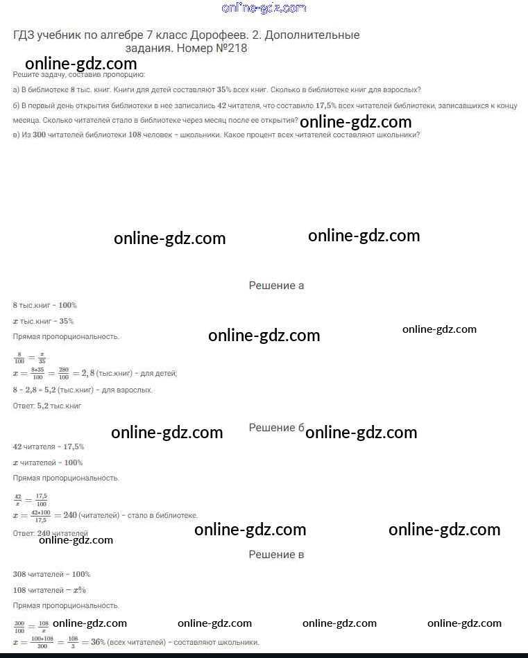 Готовые домашние задания по Алгебре за 7 класс Учебник Дорофеев, Суворова Академический школьный учебник 2020 - Упражнения 218