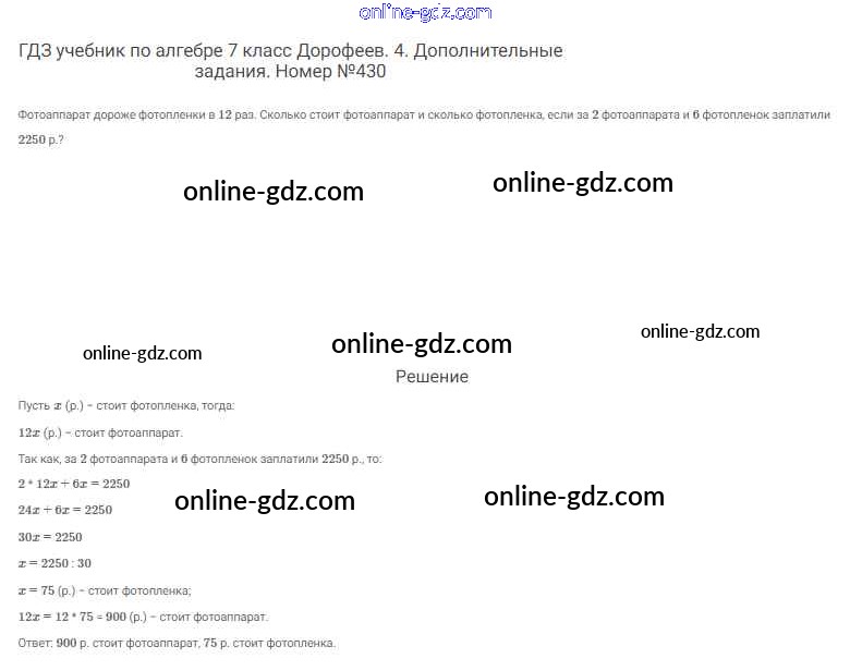Готовые домашние задания по Алгебре за 7 класс Учебник Дорофеев, Суворова Академический школьный учебник 2020 - Упражнения 430