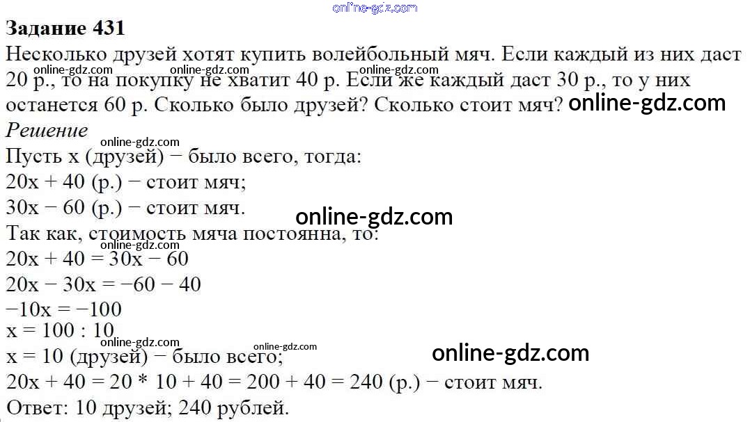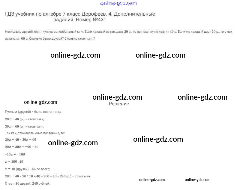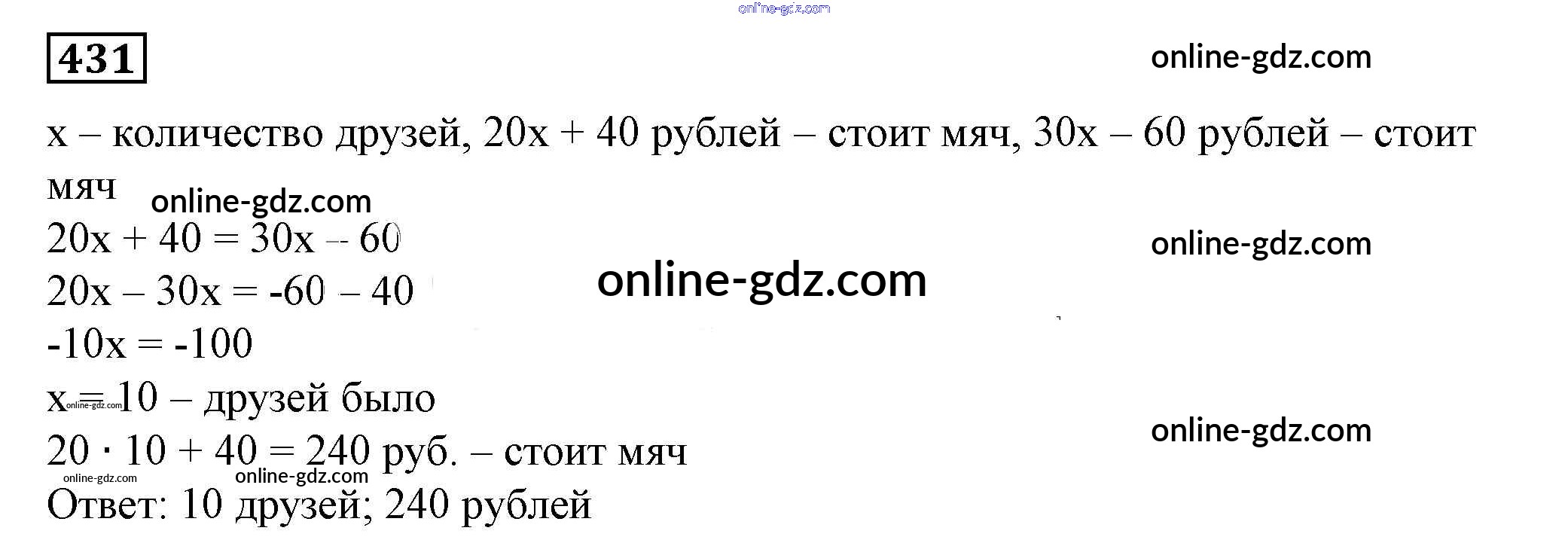 Готовые домашние задания по Алгебре за 7 класс Учебник Дорофеев, Суворова Академический школьный учебник 2020 - Упражнения 431