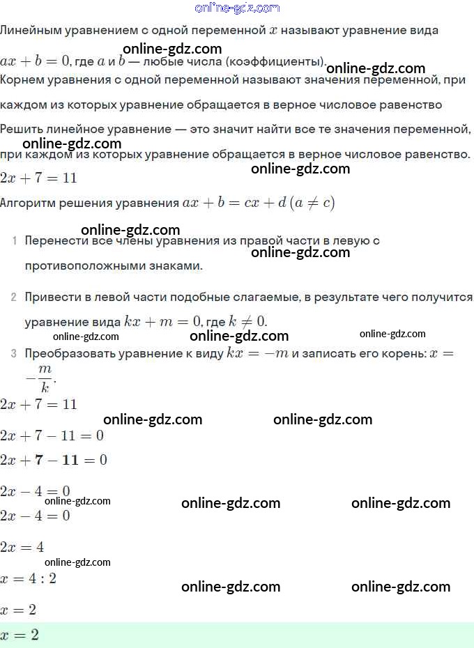Готовые домашние задания по Алгебре за 7 класс Учебник Мордкович Базовый уровень 2013 - §4. Линейное уравнение с одной переменной Глава 1. Математический язык и математическая модель 7