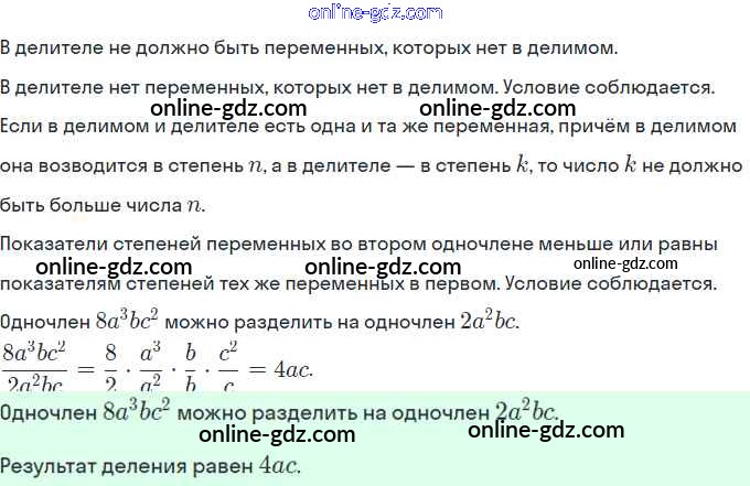 Готовые домашние задания по Алгебре за 7 класс Учебник Мордкович Базовый уровень 2013 - §23. Деление одночлена на одночлен Глава 5. Одночлены. Арифметические операции над одночленами 1