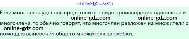 класс, от простых до сложных. Мы стремимся предоставить нашим пользователям максимально точные и полезные ответы к Учебнику Мордкович Базовый уровень - §31. Вынесение общего множителя за скобки Глава 7. Разложение многочленов на множители 1, поэтому мы постоянно работаем над улучшением нашего контента. Мы всегда готовы помочь!