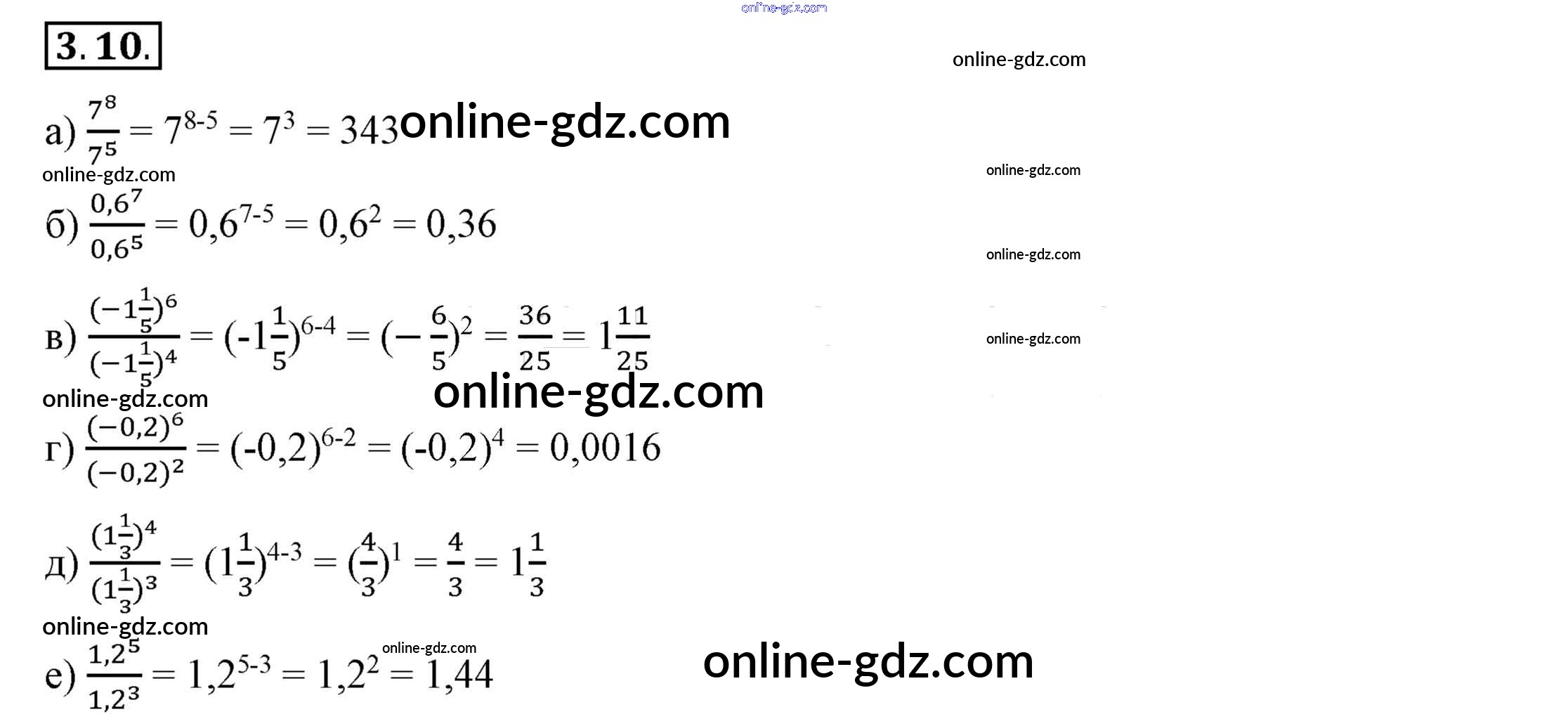 Готовые домашние задания по Алгебре за 7 класс Учебник Мордкович, Семёнов 2018 - §3. Свойства степеней с натуральными показателями 3.10