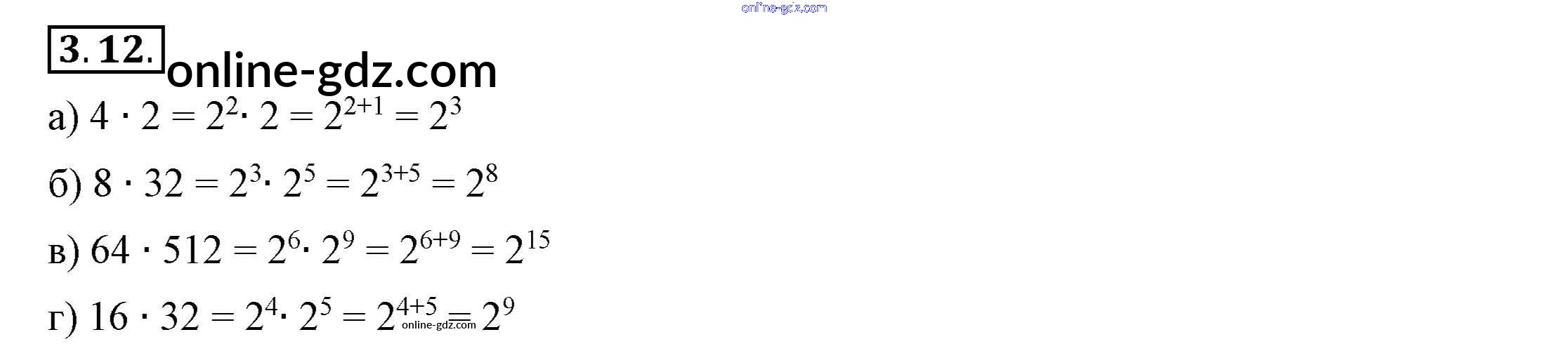 Готовые домашние задания по Алгебре за 7 класс Учебник Мордкович, Семёнов 2018 - §3. Свойства степеней с натуральными показателями 3.12