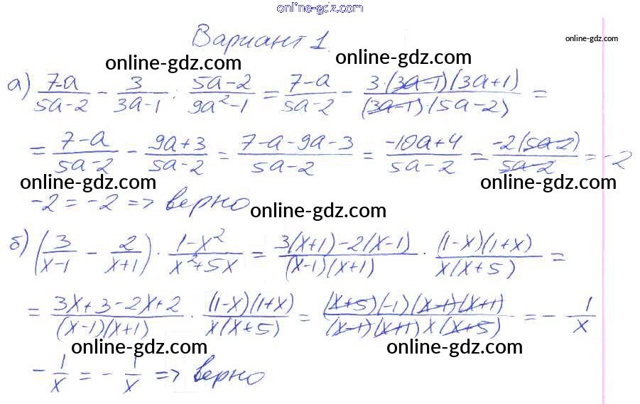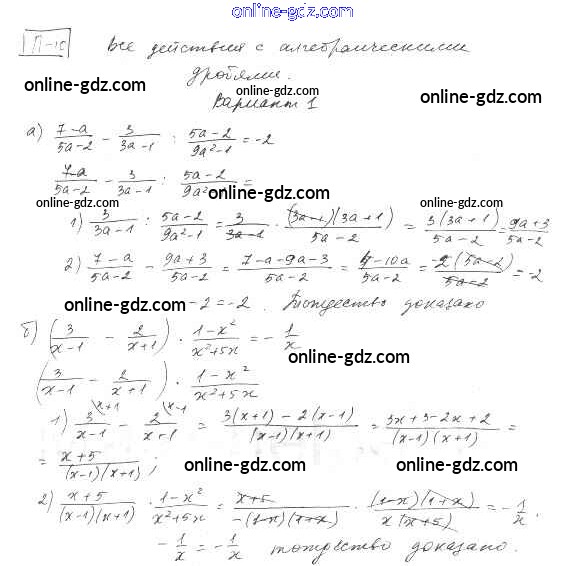 Готовые домашние задания по Алгебре за 8 класс Дидактические материалы Евстафьева, Карп 2017 - П-10. Все действия с алгебраическими дробями Проверочные задания Вариант 1
