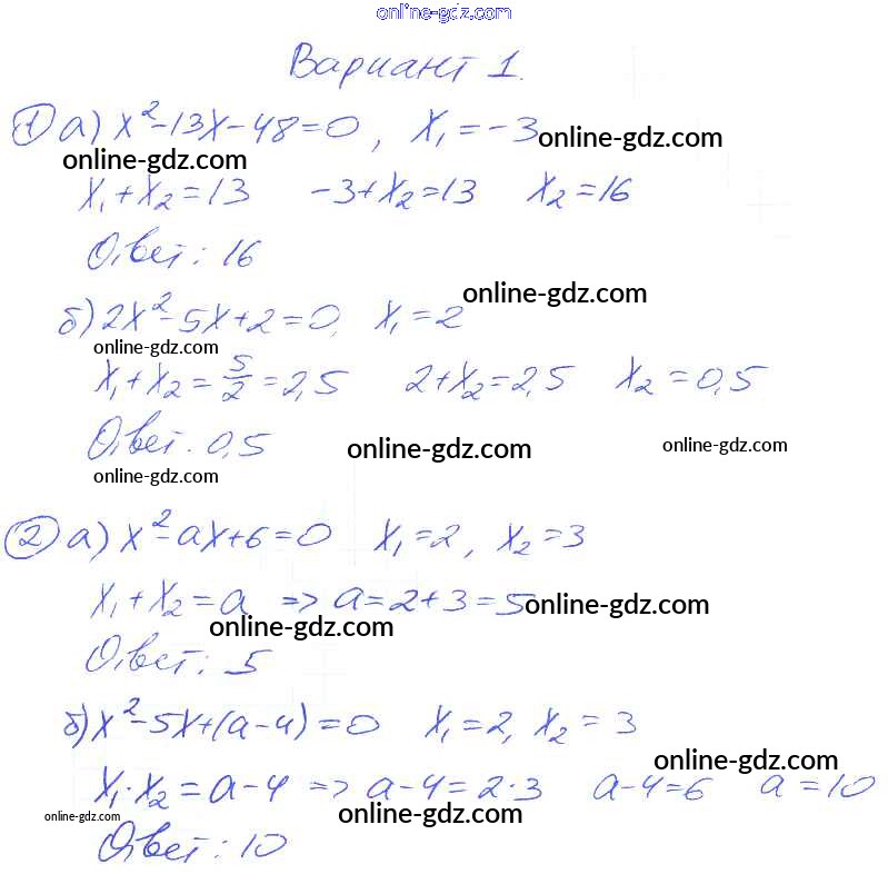 Готовые домашние задания по Алгебре за 8 класс Дидактические материалы Евстафьева, Карп 2017 - П-33. Теорема Виета Проверочные задания Вариант 1