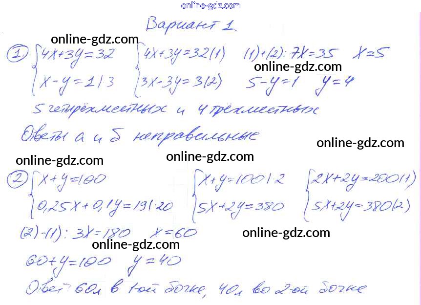 Готовые домашние задания по Алгебре за 8 класс Дидактические материалы Евстафьева, Карп 2017 - П-41. Решение задач с помощью систем уравнений Проверочные задания Вариант 1