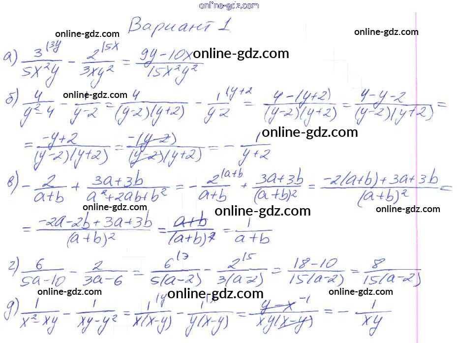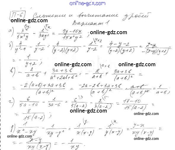 Готовые домашние задания по Алгебре за 8 класс Дидактические материалы Евстафьева, Карп 2017 - П-6. Сложение и вычитание дробей Проверочные задания Вариант 1