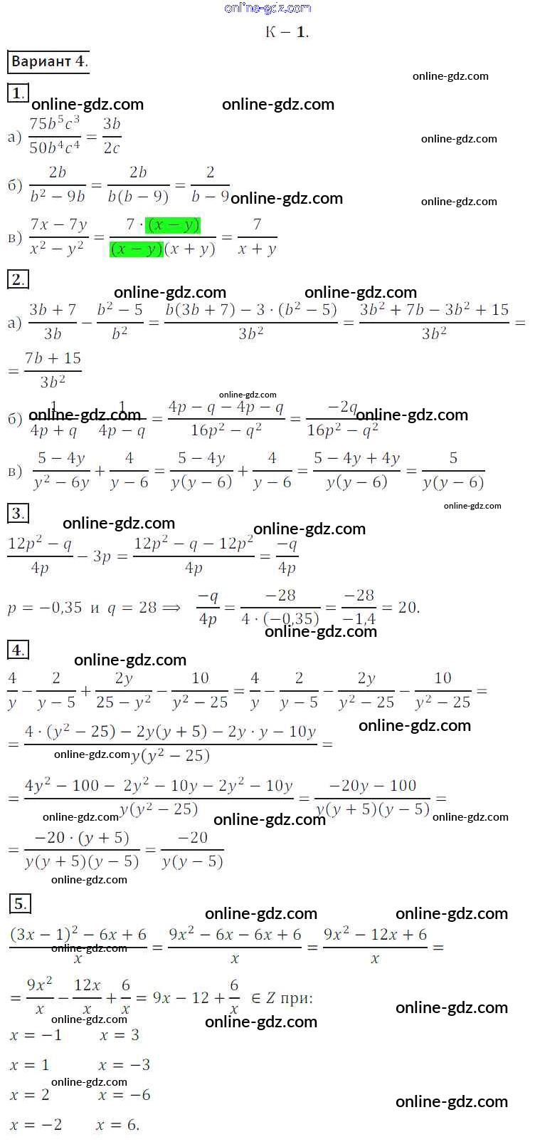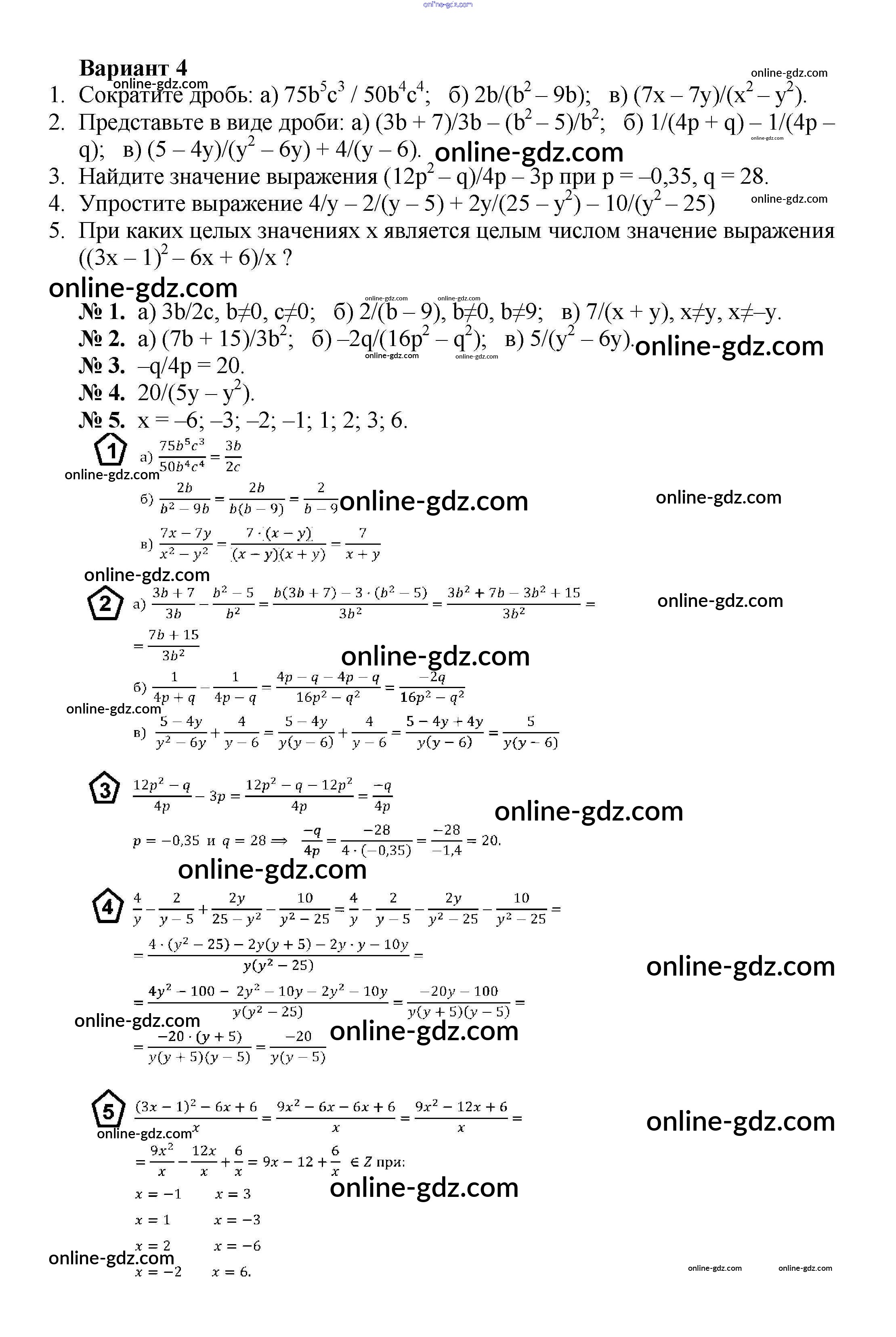 Готовые домашние задания по Алгебре за 8 класс Дидактические материалы Жохов, Макарычев 2014 - КР №1 Контрольные работы вариант 4