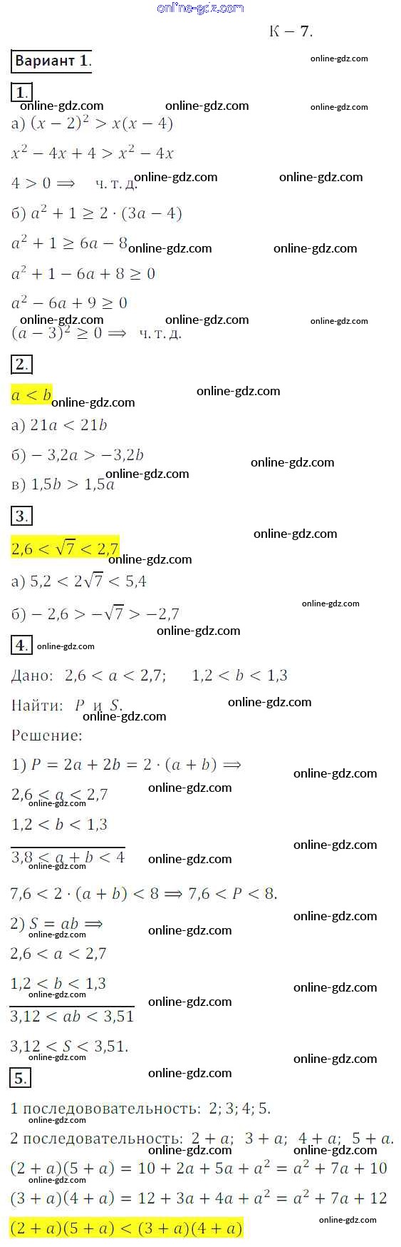 Готовые домашние задания по Алгебре за 8 класс Дидактические материалы Жохов, Макарычев 2014 - КР №7 Контрольные работы вариант 1