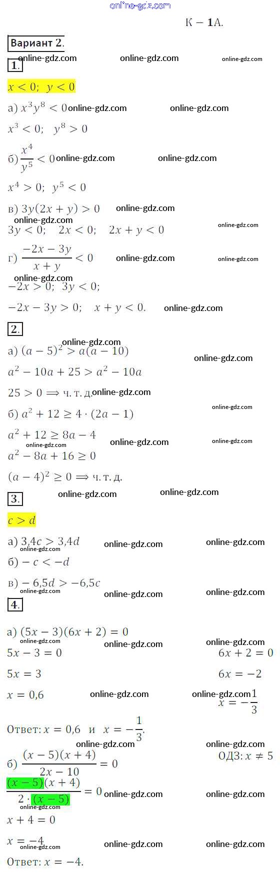 Готовые домашние задания по Алгебре за 8 класс Дидактические материалы Жохов, Макарычев 2014 - КР №1A Контрольные работы вариант 2
