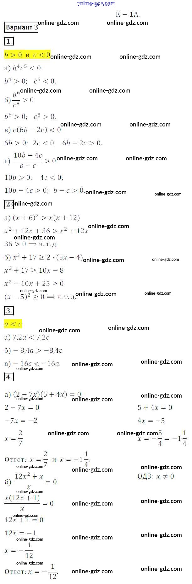 Готовые домашние задания по Алгебре за 8 класс Дидактические материалы Жохов, Макарычев 2014 - КР №1A Контрольные работы вариант 3