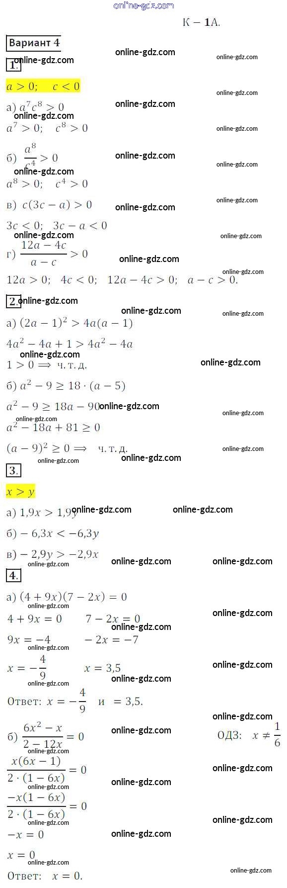 Готовые домашние задания по Алгебре за 8 класс Дидактические материалы Жохов, Макарычев 2014 - КР №1A Контрольные работы вариант 4