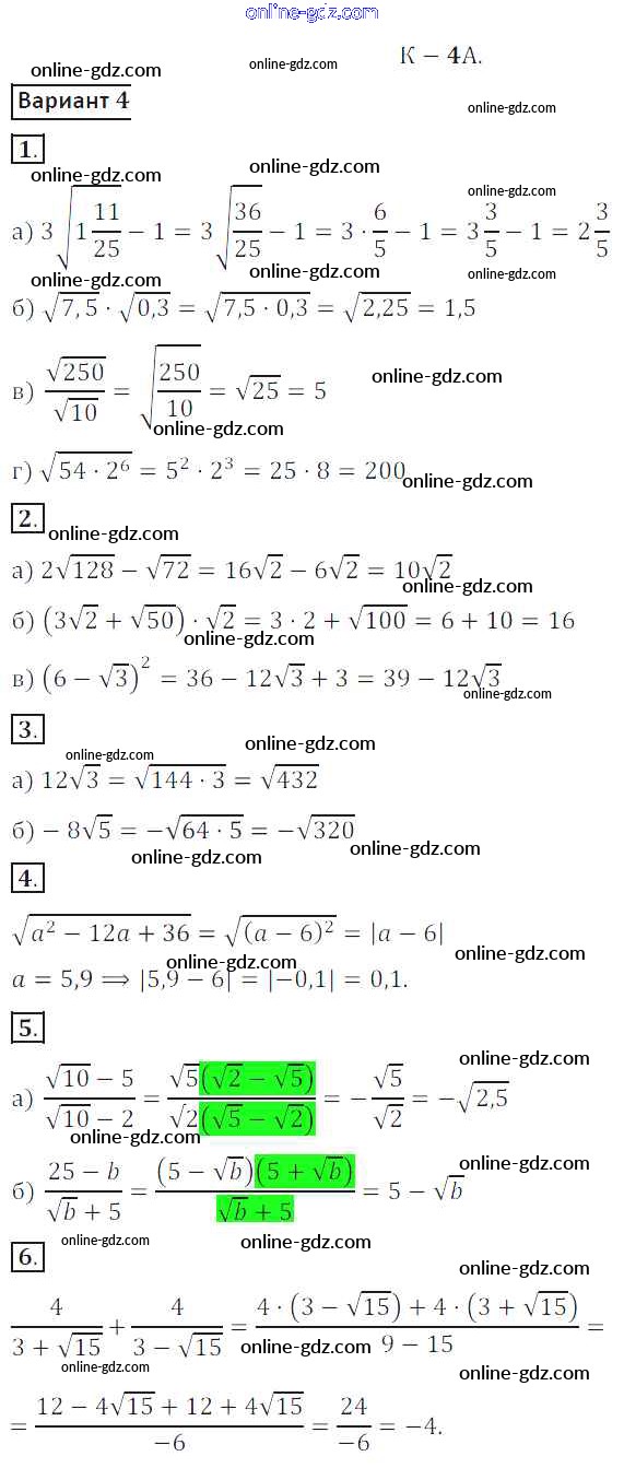 Готовые домашние задания по Алгебре за 8 класс Дидактические материалы Жохов, Макарычев 2014 - КР №4A Контрольные работы вариант 4