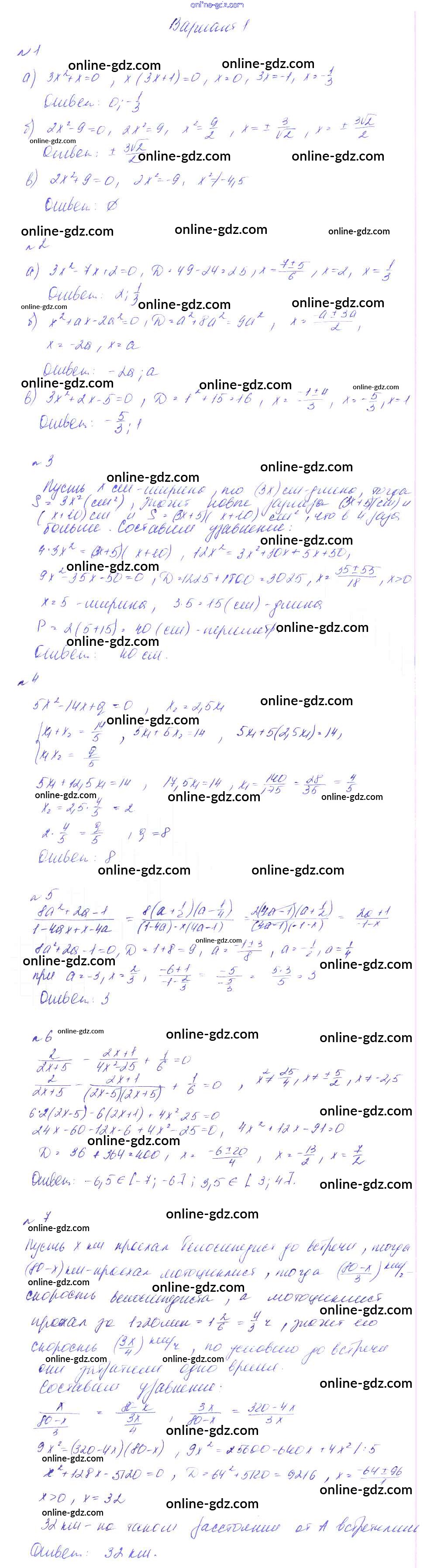 Готовые домашние задания по Алгебре за 8 класс Дидактические материалы Феоктистов 2013 - КР-4. Квадратные уравнения Контрольные работы вариант 1