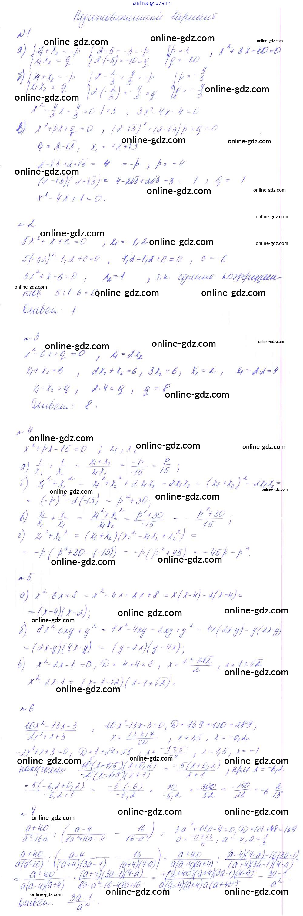 Готовые домашние задания по Алгебре за 8 класс Дидактические материалы Феоктистов 2013 - СР-15. Свойство корней квадратного уравнения, симметрические многочлены, разложение квадратного трехчлена на множ Самостоятельные работы подготовительный вариант