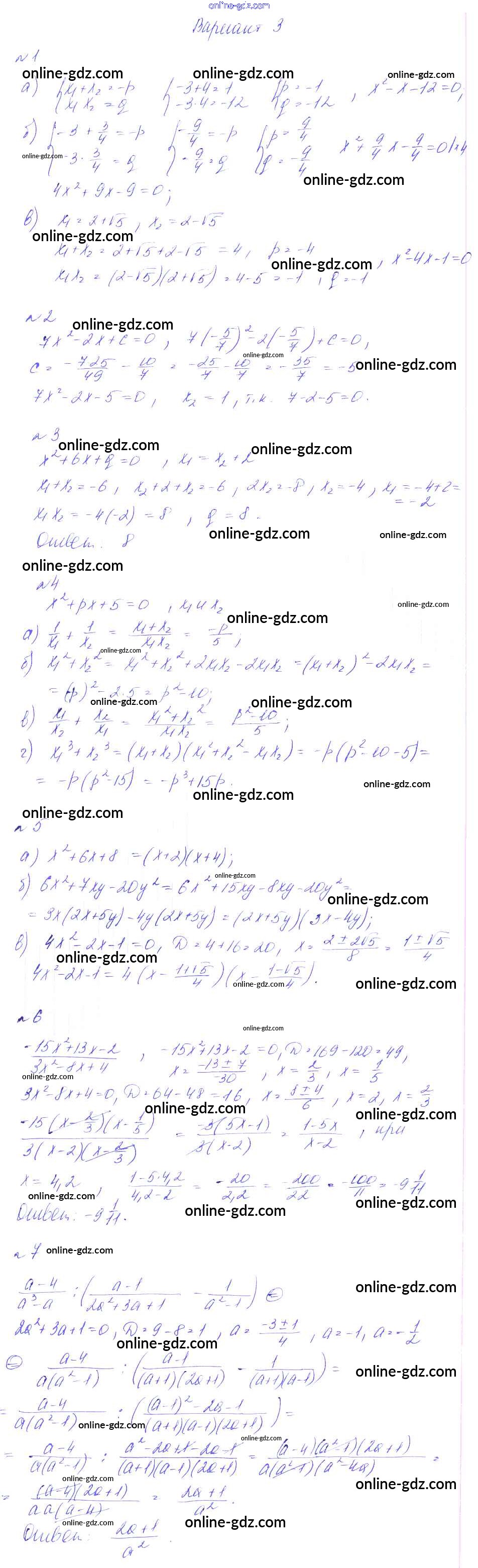 Готовые домашние задания по Алгебре за 8 класс Дидактические материалы Феоктистов 2013 - СР-15. Свойство корней квадратного уравнения, симметрические многочлены, разложение квадратного трехчлена на множ Самостоятельные работы вариант 3