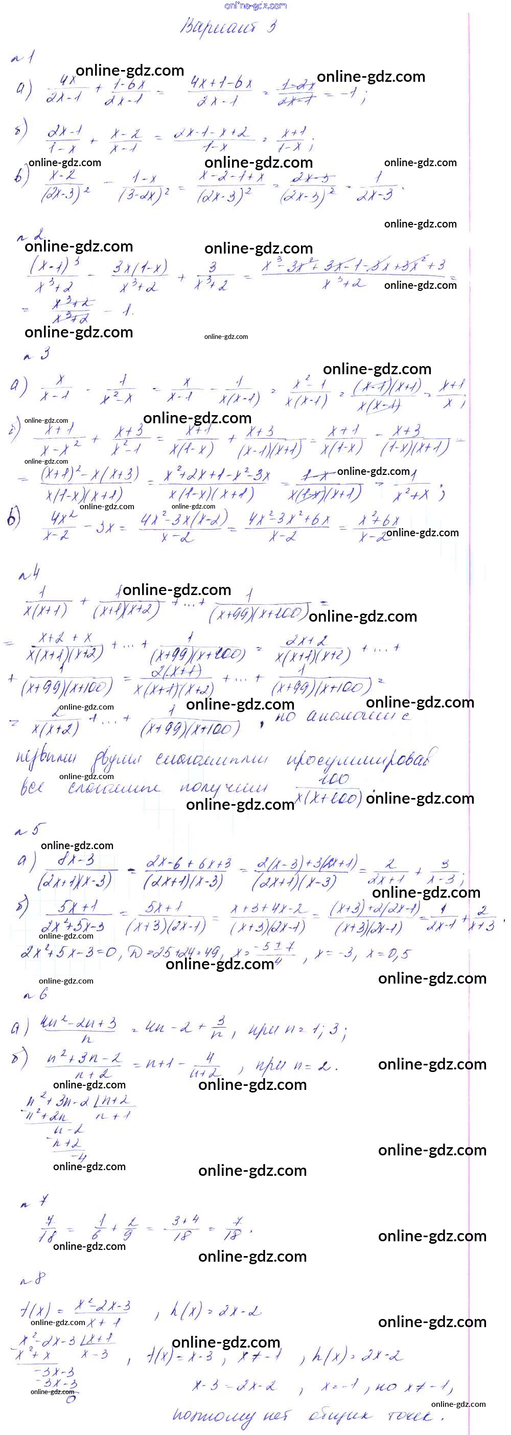 Готовые домашние задания по Алгебре за 8 класс Дидактические материалы Феоктистов 2013 - СР-3. Сложение и вычитание дробей Самостоятельные работы вариант 3