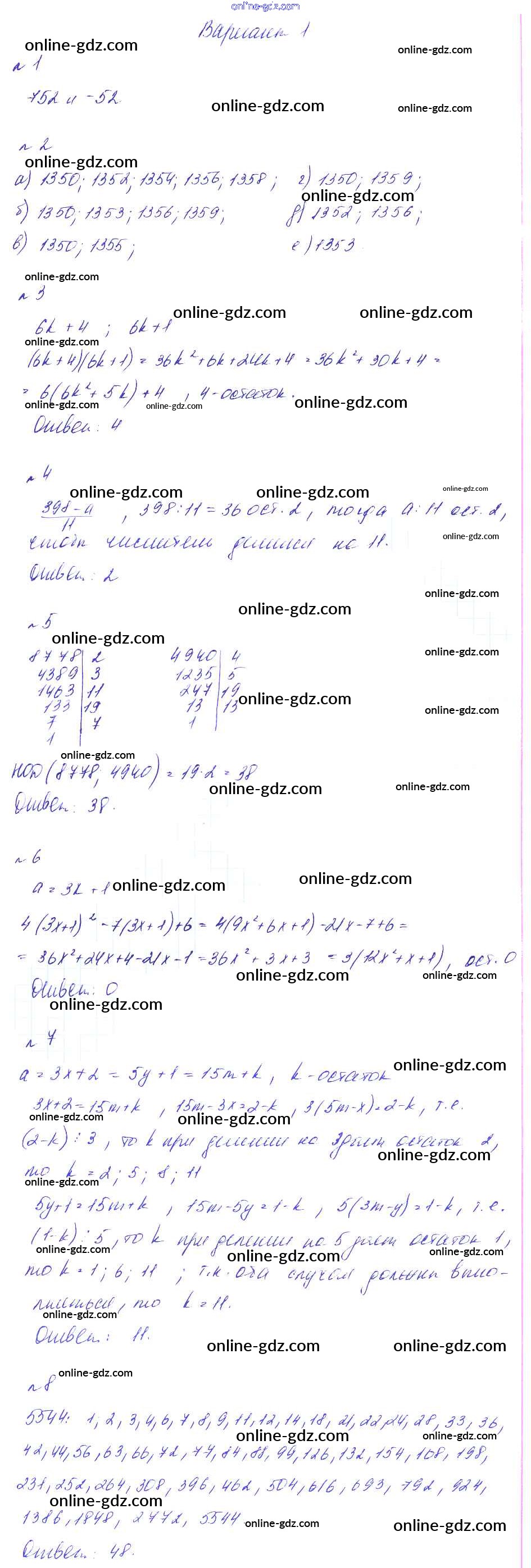 Готовые домашние задания по Алгебре за 8 класс Дидактические материалы Феоктистов 2013 - СР-8. Деление с остатком, признаки делимости, простые и составные числа Самостоятельные работы вариант 1