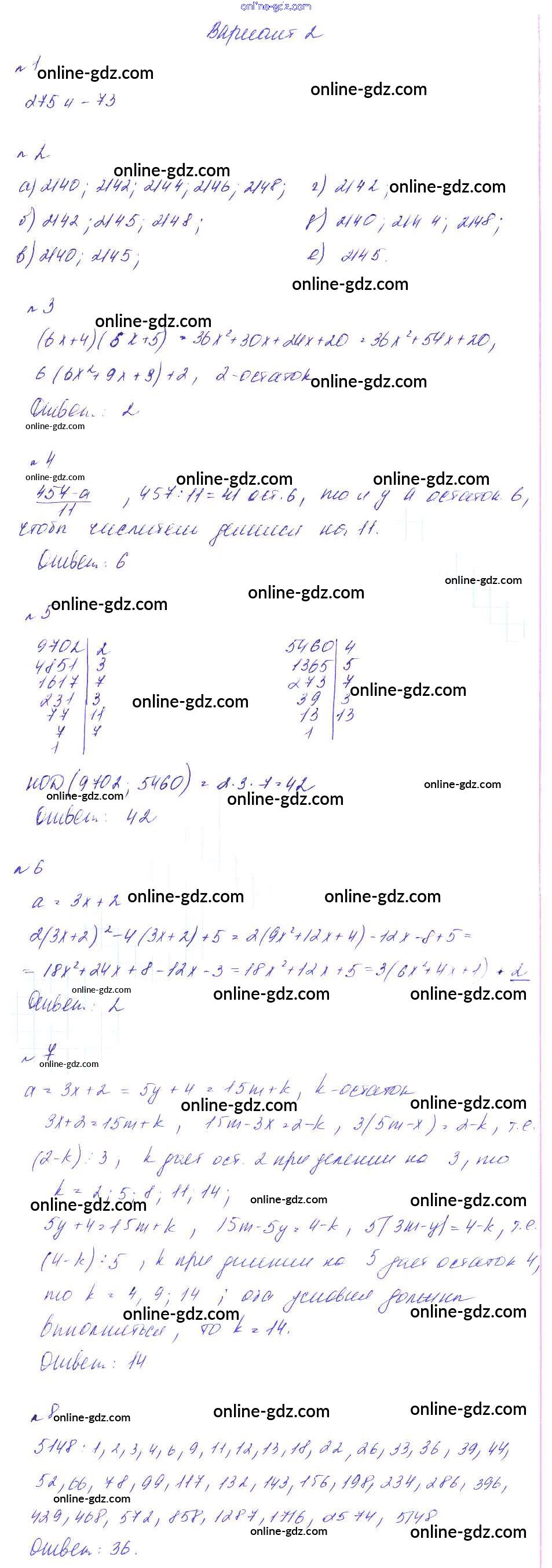 Готовые домашние задания по Алгебре за 8 класс Дидактические материалы Феоктистов 2013 - СР-8. Деление с остатком, признаки делимости, простые и составные числа Самостоятельные работы вариант 2