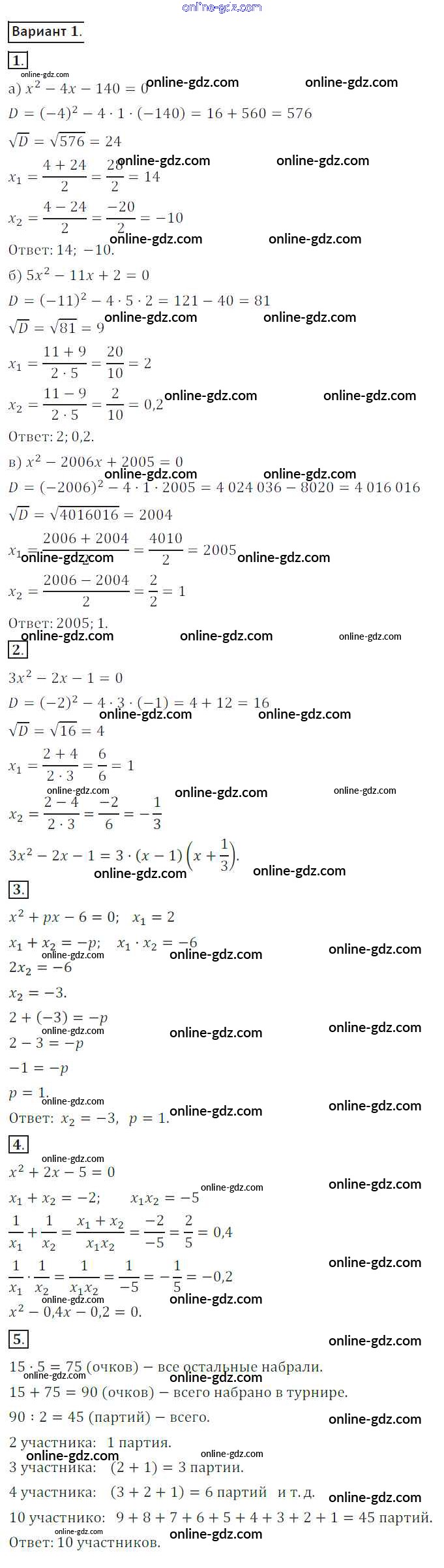 Готовые домашние задания по Алгебре за 8 класс Дидактические материалы Потапов, Шевкин МГУ - школе 2017 - КР №3 Контрольные работы вариант 1