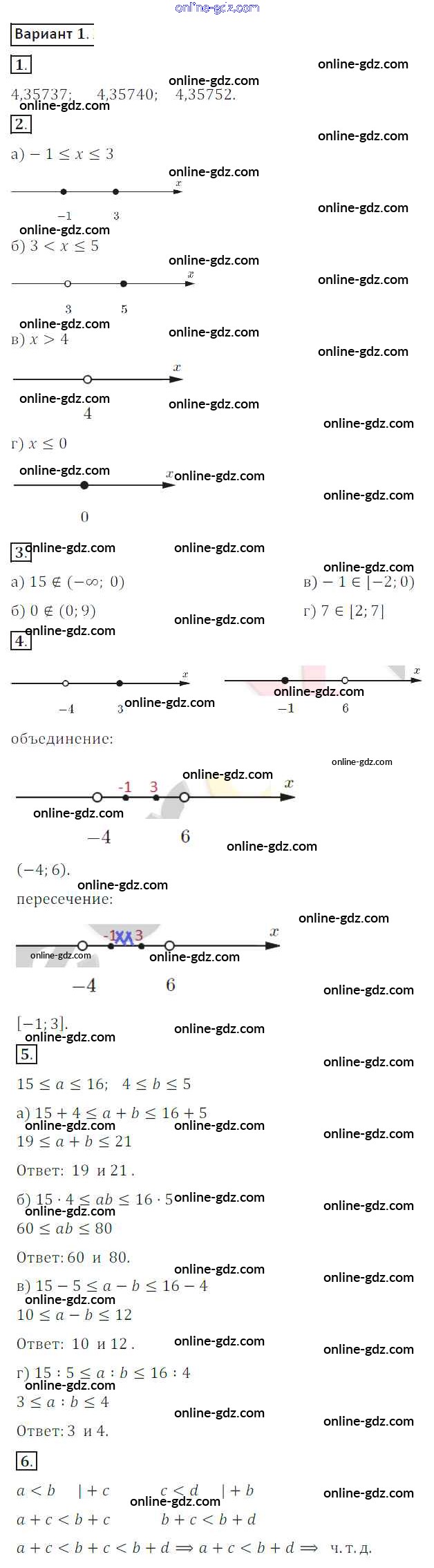 Готовые домашние задания по Алгебре за 8 класс Дидактические материалы Потапов, Шевкин МГУ - школе 2017 - СР №1. Числовые неравенства. Числовые промежутки Самостоятельные работы вариант 1