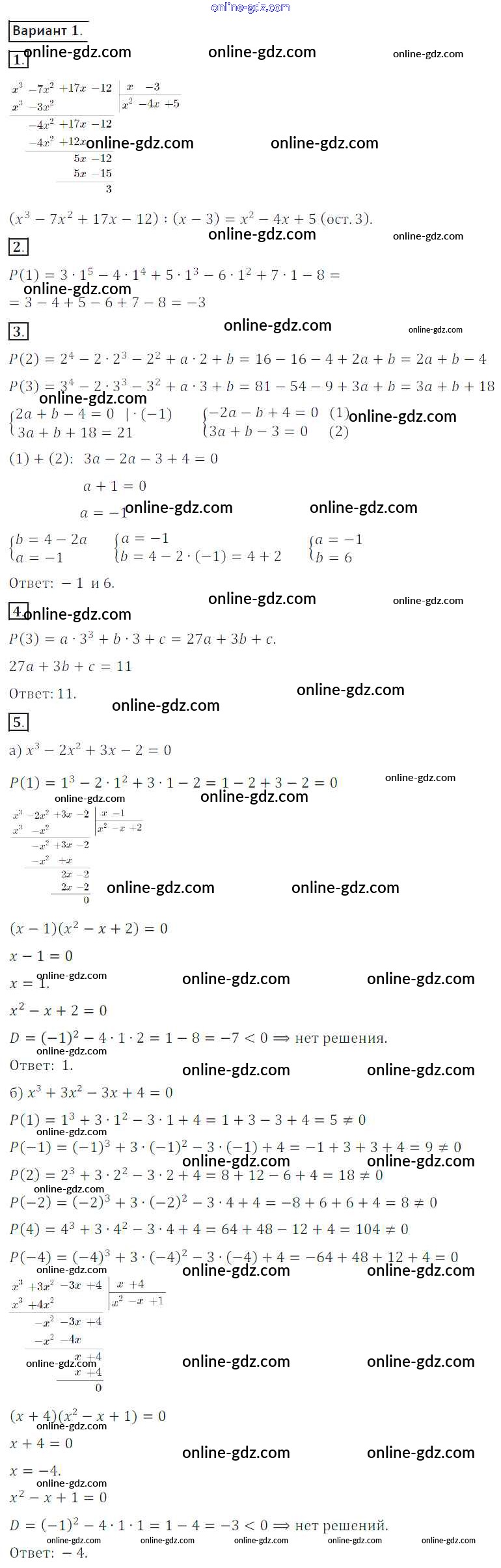 Готовые домашние задания по Алгебре за 8 класс Дидактические материалы Потапов, Шевкин МГУ - школе 2017 - СР №11. Делимость многочленов Самостоятельные работы вариант 1