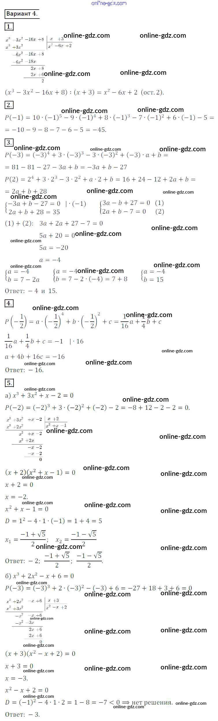 Готовые домашние задания по Алгебре за 8 класс Дидактические материалы Потапов, Шевкин МГУ - школе 2017 - СР №11. Делимость многочленов Самостоятельные работы вариант 4