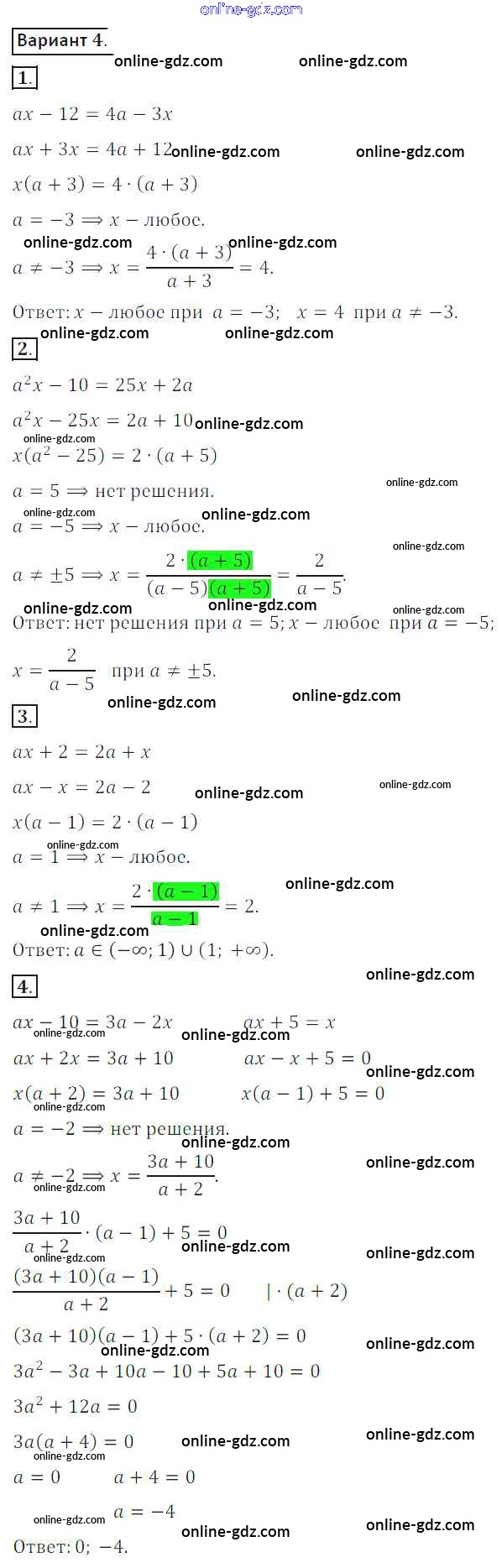 Готовые домашние задания по Алгебре за 8 класс Дидактические материалы Потапов, Шевкин МГУ - школе 2017 - СР №12. Линейные уравнения с параметром Самостоятельные работы вариант 4