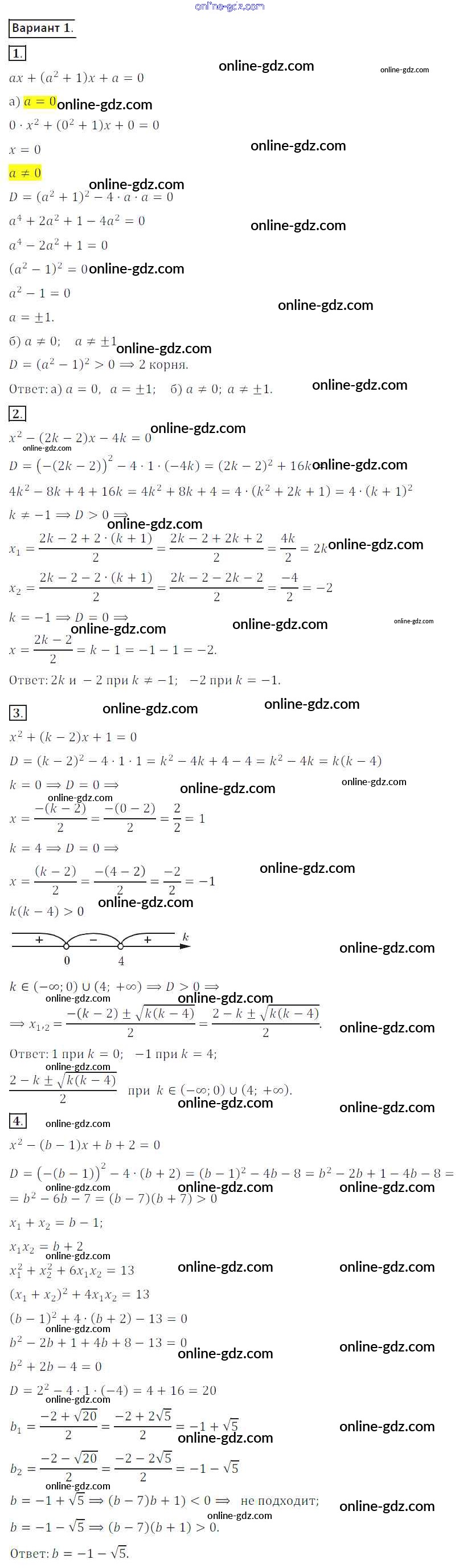 Готовые домашние задания по Алгебре за 8 класс Дидактические материалы Потапов, Шевкин МГУ - школе 2017 - СР №13. Квадратные уравнения с параметром Самостоятельные работы вариант 1