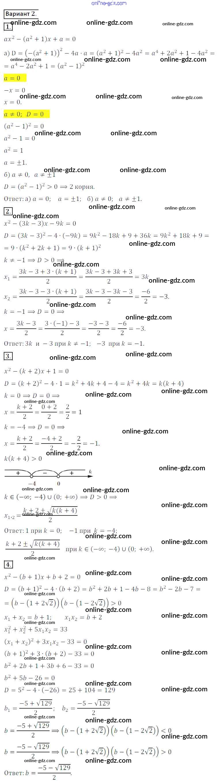 Готовые домашние задания по Алгебре за 8 класс Дидактические материалы Потапов, Шевкин МГУ - школе 2017 - СР №13. Квадратные уравнения с параметром Самостоятельные работы вариант 2