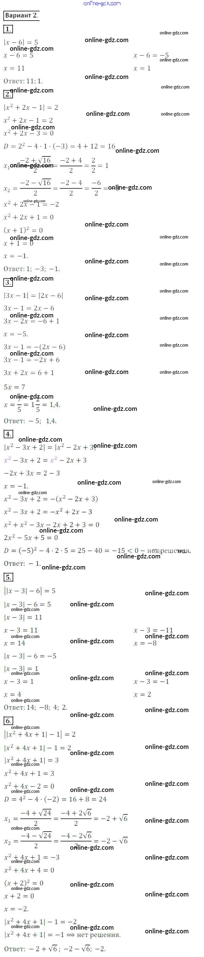 Готовые домашние задания по Алгебре за 8 класс Дидактические материалы Потапов, Шевкин МГУ - школе 2017 - СР №14. Уравнения, содержащие модули Самостоятельные работы вариант 2