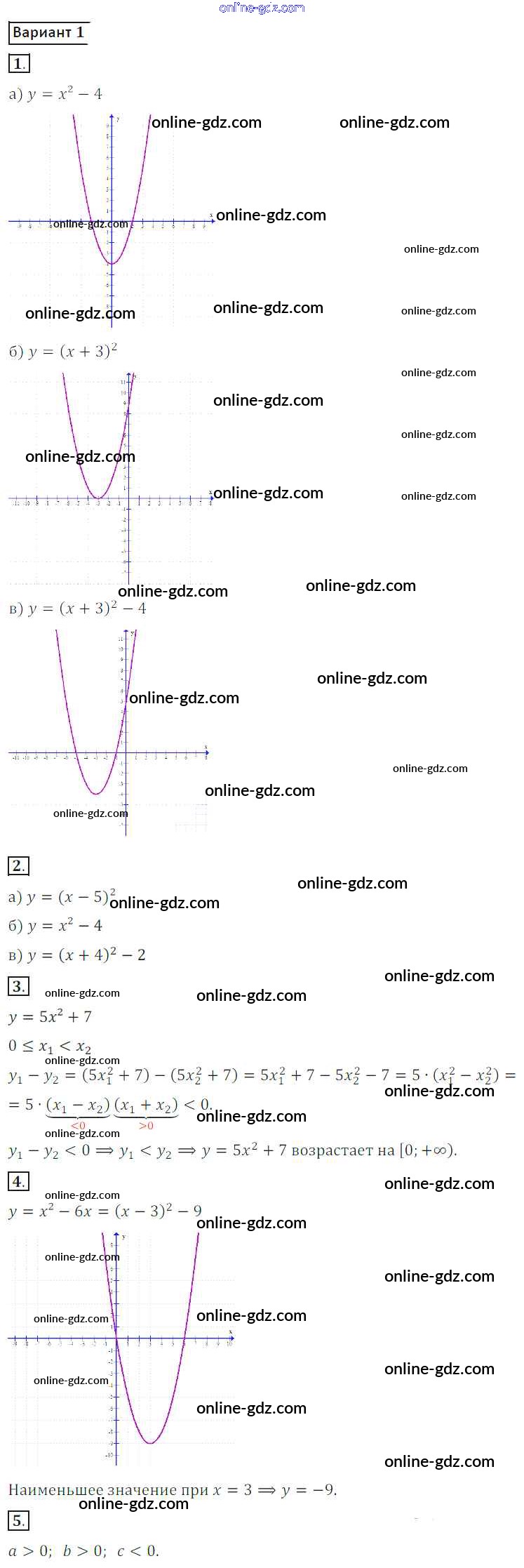 Готовые домашние задания по Алгебре за 8 класс Дидактические материалы Потапов, Шевкин МГУ - школе 2017 - СР №17. Квадратичная функция Самостоятельные работы вариант 1