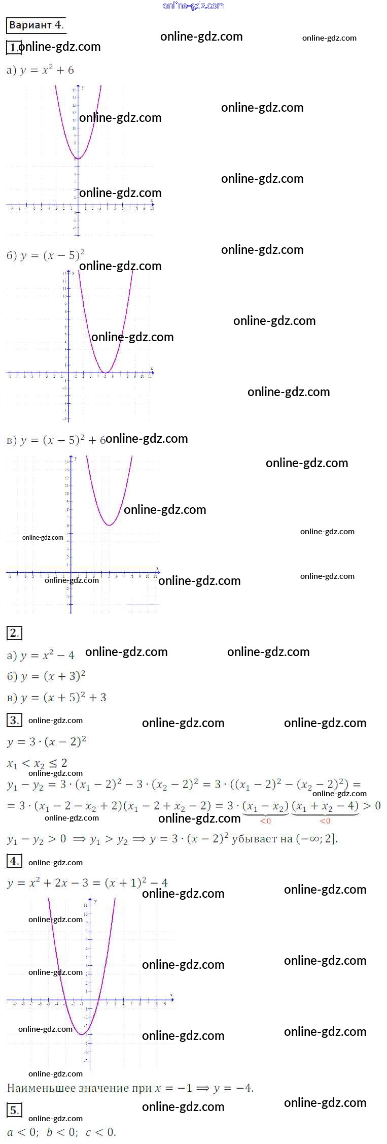 Готовые домашние задания по Алгебре за 8 класс Дидактические материалы Потапов, Шевкин МГУ - школе 2017 - СР №17. Квадратичная функция Самостоятельные работы вариант 4