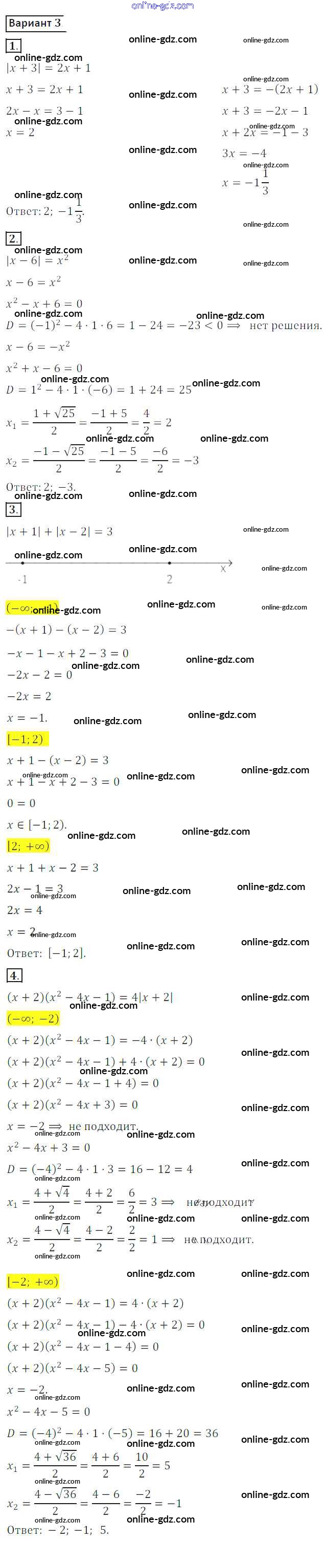 Готовые домашние задания по Алгебре за 8 класс Дидактические материалы Потапов, Шевкин МГУ - школе 2017 - СР №19. Уравнения, содержащие модули Самостоятельные работы вариант 3